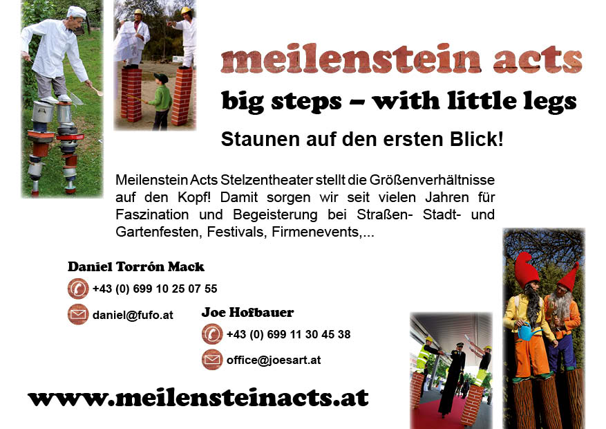 Wir sind das Künstlerduo Daniel Torrón Mack und Joe Hofbauer. Wir sorgen seit vielen Jahren mit unserem Stelzentheater für Faszination und Begeisterung bei Straßen- Stadt- und Gartenfesten, Festivals, Firmenevents,...